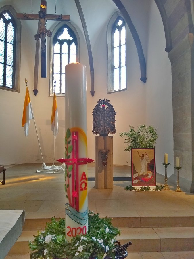 Die neue Osterkerze lädt ein zum Gebet. Weihwasser in unseren Kirchen.