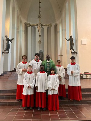 Dann war es soweit: Bernhard Löser (im übrigen der Ideengeber) gab bekannt, dass Pfr. Thomas Geburtstag hat und es folgte das Lied "Happy Birthday" mit allen Gottesdienstbesucher*innen. Direkt danach erklang "Mit 66 Jahren", bei dem der Refrain mitgesungen werden konnte - und es wurde kräftig mitgeklatscht. Nach dem Schlussakkord erfolgte ein fröhliches "Jambo jambo" seitens der Band - die Begrüßungsworte von Pfr. Thomas bei jedem Treffen. Ein herzlicher Applaus von allen Gottesdienstbesucher*innen für das Geburtstagskind rundete die besondere Einlage an diesem Gottesdienst ab. Pfr. Thomas war sehr überrascht und bedankte sich mit herzlichen Worten. Im Anschluss an den Gottesdienst wurde ein Erinnerungsfoto mit den Ministrant*innen gemacht bevor es zum Sektempfang in den Eingangsbereich der Kirche Herz Jesu ging.