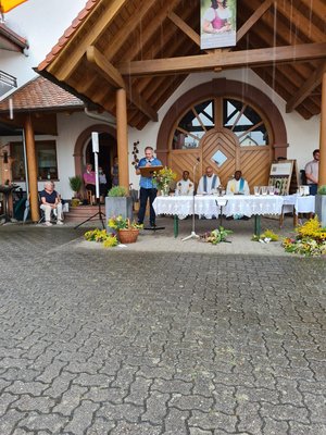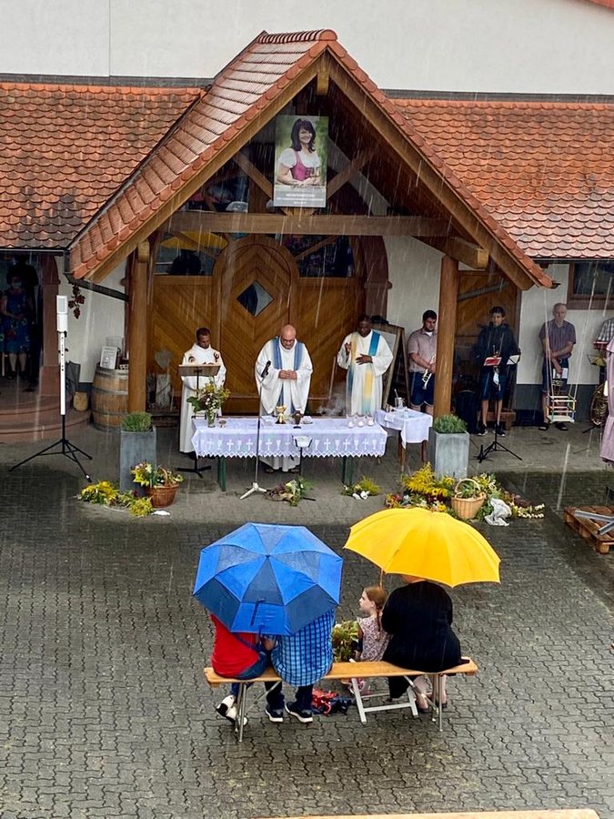 Das angrenzende Weingut Reinhard stellte spontan seinen Hof zur Verfügung, so dass ein Teil der Gottesdienstteilnehmer und auch die Zelebranten und Musiker der Martinskapelle im überdachten Bereich die Messe feiern konnten. Die restlichen Gemeindemitglieder waren beschirmt.