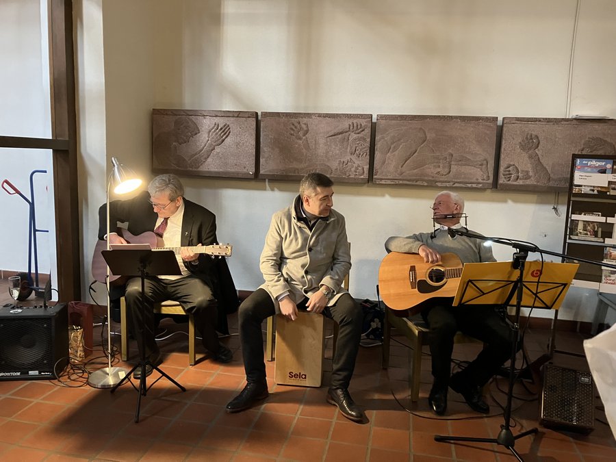 Im Anschluss an den Gottesdienst waren alle zu einem Umtrunk mit Gebäck, Brezeln und Schokoküssen eingeladen. Hier gab es noch eine besondere Überraschung: Mitglieder der Band, in der Pfr. Meißner privat spielt, waren gekommen - nicht, um Pfr. Meißner ein Ständchen zu bringen, sondern um gemeinsam mit ihm zu musizieren. Dies wurde von allen Anwesenden mit herzlichem Applaus belohnt.