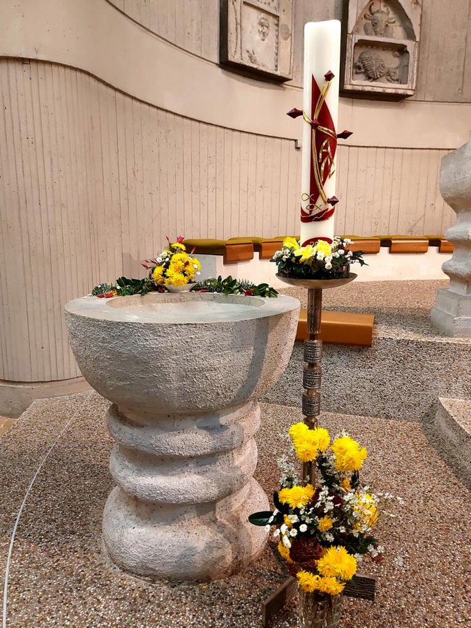Geschmücktes Taufbecken mit Osterkerze, Fotos: Gertrud Schwartz