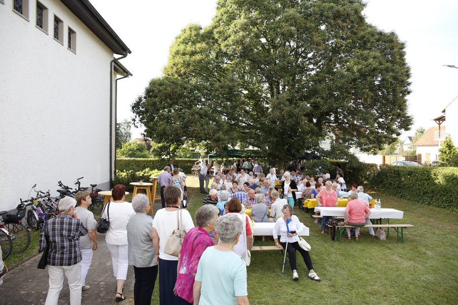An den Gottesdienst schloss sich ein Sommerfest auf dem Außengelände an. Die Abendsonne oder den Schatten des großen Esskastanienbaumes neben der Kirche genossen dabei nicht nur die Schwegenheimer, sondern auch Gemeindeangehörige aus Sondernheim, Lingenfeld, Westheim und Germersheim. „Beim Einzug vorhin war ich sehr erleichtert und froh, als ich gesehen habe: unsere neue Kirche ist voll“, freute sich Pfarrer Jörg Rubeck und fuhr fort: “Es ist großartig, dass Menschen aus allen Gemeinden der Pfarrei hier sind.”