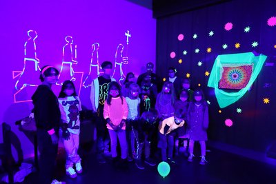 Für das Motto „Neon-Party“ wurde der große Saal, neben bunten Partylichtern, mit Schwarzlicht ausgestattet, welches viele Accessoires zum Leuchten brachte. Neben dem Messdienerlogo, einem Sternenhimmel, Luftballons und Gesichtsfarben erglühten in dem Licht auch Sterne und Augen, welche die Kinder auf die bunten OP-Masken kleben konnten, um die Maskenpflicht etwas zu verschönern.