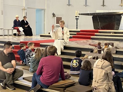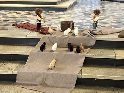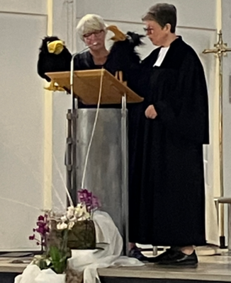 Am Sonntag, 24. September 2023, wurde dann erstmalig im Nachklang zum Kinderkirchentag ein Ökumenischer Familiengottesdienst für Groß und Klein in der Kirche St. Sebastian gefeiert. Hier wurde die Geschichte von Abraham's Reise von Gemeindereferentin Renate Kröper weitererzählt. Zunächst saßen die Kinder rund um die Biblischen Erzählfiguren und berichteten den Erwachsenen, was Schafe alles benötigen. Nach einem spannenden Brunnen-Suchen in der ganzen Kirche wurde die Geschichte von Abraham und Lot sowie dem Streit ihrer Hirten und Knechte, pantomimisch untermalt, weitererzählt. Letztlich trennen sich Abraham und Lot ohne Streit und ziehen beide ihrer Wege. Die Raben Felix und Habakuk (gesprochen von Christiane Runge und Pfarrerin Birgit Kiefer) resümmierten nochmals das Gehörte und stellten fest, dass gemeinsames friedliches Zusammenleben am besten für alle ist.