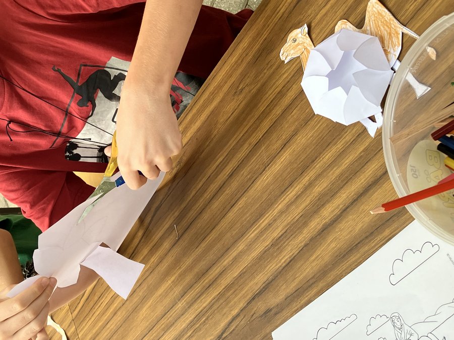 Schon beim Eintreffen an der Christuskirche war zu sehen, welches Ereignis heute stattfand: ein großes bemaltes Tuch hieß alle Kinder herzlich willkommen zum diesjährigen Kinderkirchentag. Dieser stand unter dem Motto "Abrahams Abenteuerreise". Im Erzählzelt wurde in Etappen von Pfarrerin Birgit Kiefer die spannende Geschichte von Abraham und seiner Frau Sara erzählt. Daneben gab es 5 Kreativangebote, die sich sehen lassen konnten und natürlich Bezug nahmen auf die Geschichte von Abraham. Beim Angebot "Himmelszelt" konnte auf Malkarton der Himmel gemalt werden; anschließend wurden Lichterketten darin eingearbeitet. Ein Mädchen freute sich: "Das kann ich mir neben mein Bett hängen und habe ein neues Nachtlicht." Am Tisch nebenan wurde passend zum Motto "Sandsturm" Sand eingefärbt und in Gläschen gefüllt. Beim dritten Angebot "auf Wanderschaft" hatten die Kinder Gelegenheit, kleine Stoffbeutel herzustellen. Beim vierten Bastelangebot wurden Kamele und Wüstenrosen aus Papier ausgeschnitten. Als besonderes Angebot wurde in der Backwerkstatt Fladenbrot gebacken. Zwischendrin gab es natürlich auch eine wohlverdiente Imbisspause mit leckeren Muffins. Dass es den Kindern gefallen hat, war der Begeisterung bei allen Angeboten anzumerken.