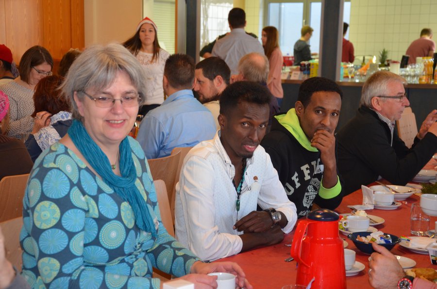 Im Anschluss an das Essen gab es bis in den Nachmittag hinein verschiedene kleine Gesprächsrunden, so dass jeder mit jedem sprechen konnte. Die KjG'ler hatten außerdem ein Bastel- und Unterhaltungsprogramm für Kinder vorbereitet. Eher für die erwachsenen Besucher bestimmt war ein Spiel über Weihnachtslieder, die rückwärts eingespielt wurden und dann erraten werden mussten. Um Spiel und Spaß ging es auch beim gemeinsamen Kicken auf dem Außengelände des Pfarrheims – ganz spontan hatten hier junge Flüchtlinge aus Eritrea und KjG-Jungs aus Lingenfeld zusammen gefunden. Am Nikolaustag durfte natürlich ein Besuch eines besonderen Gastes nicht fehlen, der von Bischofs Nikolaus. Auch einige der Flüchtlinge kannten das Brauchtum rund um den Nikolaus aus ihrer Heimat.