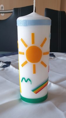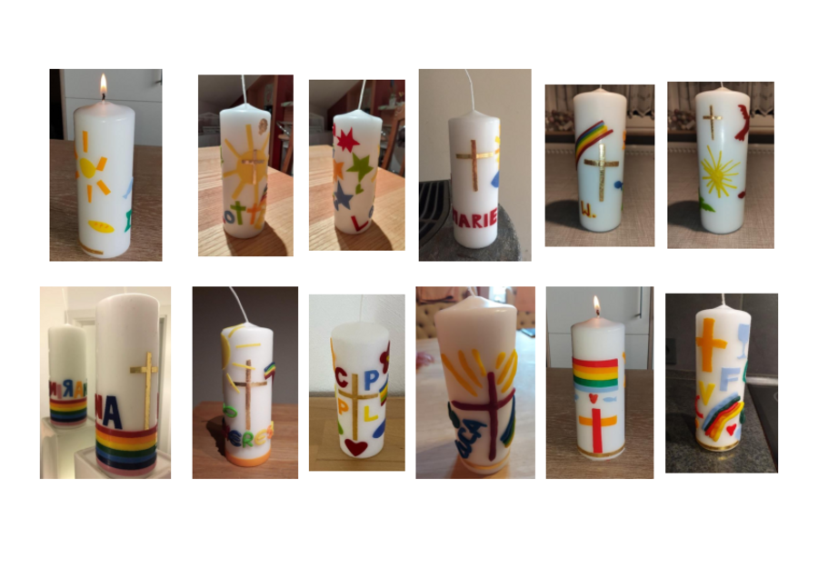 Als Symbol, dass Jesus immer - aber bewusst auch bei diesen Gesprächen - in unserer Mitte ist, haben die Kinder eine eigene Familienkerze gestaltet. Hier können Sie einige davon sehen: