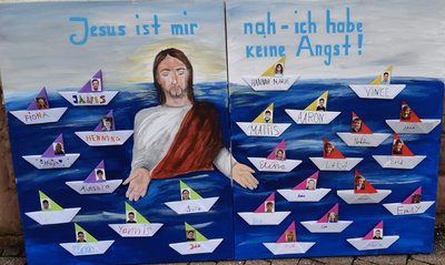 37 Kinder freuen sich auf ihren großen Tag: am Sonntag, 07. April 2024 stehen die Kirchen in Herbitzheim und Medelsheim für sie bereit. Die Vorstellungsplakate sind fertiggestellt und tragen das Motto der diesjährigen Erstkommunionvorbereitung: "Jesus ist mir nah - ich habe keine Angst". Die bekannte Geschichte vom Sturm auf dem See (Mk 4, 35-40) ist dabei Leitmotiv und wird auch in den Gottesdiensten am Weißen Sonntag eine Rolle spielen. Auf den Bildern ist Jesus mit dabei und die Schiffe mit den Kommnunionkindern sind nicht allein. Jesus ist ihnen nah. Das macht Mut in einer Zeit, in der so vieles auch unseren Kindern Angst machen kann.