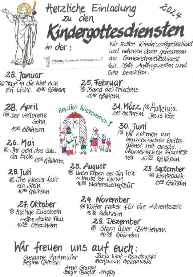Meistens findet der Kindergottesdienst in Göllheim im Nepomukhaus statt, im August treffen wir uns in Weitersweiler am Bürgertreff anlässlich der Kerwe und im Oktober in Ottersheim im Pfarrheim anlässlich des Jubiläums der kfd Ottersheim.