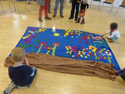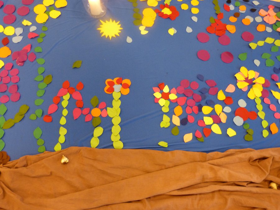 Im Miteinander entstand ein großes Bodenbild, das uns den Weg von der Zwiebel zur prächtigen Blume zeigte.