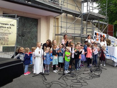 Nach dem Gottesdienst sorgten die „Hemmer-Hau- Singers“ für musikalische Unterhaltung. Die kleinen Gäste durften sich dann an der Hüpfburg austoben, bei der Feuerwehr mit Wasser spielen, im Kindergarten malen, basteln, die Haare flechten lassen und auf Schatzsuche gehen. Die Messdiener und Konfirmanden boten Kinderschminken und Spiele an, so dass für jeden Geschmack etwas dabei war. Die rhythmische Sportgymnastik-Gruppe des Turnvereins Brücken unter Leitung von Eva Biehl sorgte zwischendurch mit Ihrem Auftritt für Kurzweil bei den Gästen.