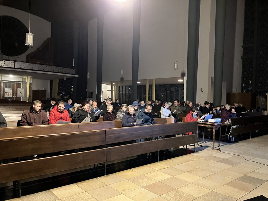 Für das letzte Adventsfenster hatten sich die vorbereitenden Familien Birkle, Castro und Nellen eigentlich ausgemalt, dass dieses auf dem Kirchenvorplatz stattfindet und das Bilderbuchkino zur Geschichte "Die kleine Glocke, die nicht läuten wollte" am Turm gezeigt werden könnte. Leider meinte es das Wetter nicht gut, so dass in die Kirche ausgewichen wurde. Das tat jedoch der Geschichte selbst keinen Abbruch: in dieser wird von einer kleinen Glocke erzählt, die partout nicht läuten will, während die größeren Glocken bereits für Weihnachten üben. Die Taube Felidia gibt sich alle Mühe, das gute Wort zu finden (die Krähe Carol hatte ihr gesteckt, dass gute Worte immer helfen...), welches die kleine Glocke zum Schwingen bringt. Viele Helfer*innen suchen und finden Worte (manchmal auch subjektiv gute Worte wie beispielsweise die Mäuse, die alle möglichen Käsesorten aufzählen), aber die kleine Glocke hört immer nur zu. Bis dann ganz am Ende ein kleines Licht den Marktplatz erhellt. Von diesem Licht wird erzählt, dass es in jedem Jahr aus Bethlehem in die ganze Welt gebracht wird, um Frieden zu bringen. Und siehe da: Friede ist das Wort - die kleine Glocke beginnt zu schwingen und zu klingen. "Frieden auf Erden - überall" - vielleicht können wir das auch hören, wenn wir an Weihnachten das Festgeläut unserer Kirchenglocken hören. Neben einem gemeinsamen Gebet wurde auch viel gesungen unter musikalischer Begleitung durch Jens Klaus.