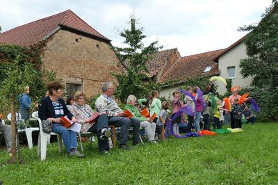 Um 17 Uhr traf man sich dann zum ökumenischen Gottesdienst im Pfarrgarten. Bei der abwechslungsreichen und musikalisch bunten Dankfeier wurde sehr anschaulich verdeutlicht wie viele unserer Lebensmittel in unseren Haushalten durchschnittlich im Müll landen. Es wurde aber auch aufgezeigt, was jede/r einzelne tun kann, um wertvolle Lebensmittel zu retten. Unsere Schöpfungstage tragen ebenfalls dazu bei das Obst auf unserer Gemarkung sinnvoll zu verwerten. In den vergangenen 10 Jahren wurden bei der Aktion insgesamt ca. 14.000 LiterApfelsaft hergestellt und ein Gewinn von rund 15.000 € konnte gespendet werden. Aber es gibt noch andere tolle Initiativen in unseren Orten wie z.B der „Fairteiler“ in Kirrweiler oder der „Allesteiler“ in Maikammer.
