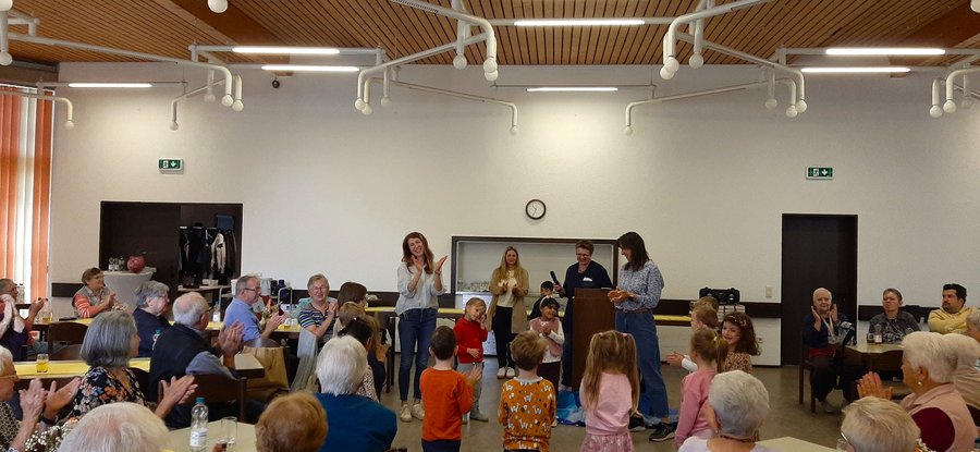 Nach einer kurzen Erzählpause wurde es Zeit sich zu bewegen. Mit viel Spaß folgten alle den Sitztanz-Anweisungen der Malteser-Referentin Elisabeth Ziemer. Somit hatten sich alle das köstliche Mittagessen im Anschluss redlich verdient. Pfarrer Thomas Cherono sang und tanzte zur Freude aller das Tischgebet in seiner kenianischen Muttersprache. Pünktlich zur anschließenden Mittagspause lockte die Sonne zu einem kurzen Spaziergang. Derweil bereiteten sich Birgitta Scheib und Marianne Rohrer-Hartkorn vom Seniorenrat der Stadt Ludwigshafen e.V. auf ihren interessanten, informativen und kurzweiligen Vortrag vor. Dabei war Sicherheit im Alter ein großes Thema. Viele Gäste haben an diesem Tag eine SOS-Dose mit nach Hause genommen, um künftig für alle Notfälle gewappnet zu sein. Die „Singing Socks" des Caritaskreises St. Sebastian begeisterten mit Darbietungen aus dem Film „Sister Act“. Anschließend erheiterte Karin Weickert alle mit einem bayrischen Sketch. Doris Besel, die neue Quartiersmanagerin des Dichterquartiers, warb für verschiedene interessante Angebote, wie z. B. die monatlichen Spielenachmittage. Anni Braun und Elsbeth Jorek vom KDFB Herz Jesu bauten inzwischen ein wunderbares Kuchenbuffet auf. Allen Bäckerinnen ein herzliches Vergelt´s Gott!